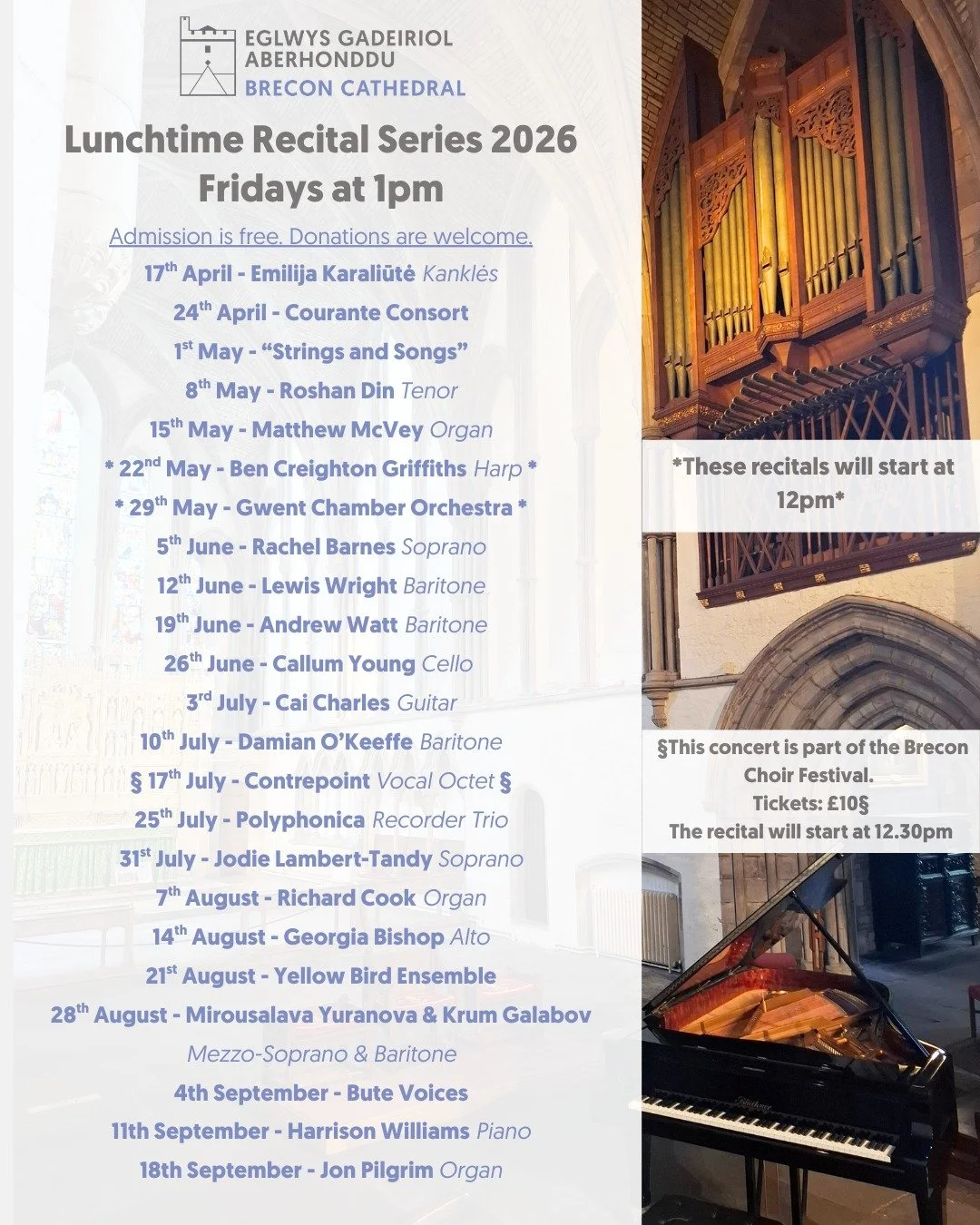 Brecon Cathedral’s Lunchtime Recital Series 2026 returns 17th April. A wonderful way to spend your lunch hour. All concerts are free to attend, but donations are welcome. Welcoming a mix of familiar and new performers with varied musical talents, a real treat. All concerts start at 1pm.