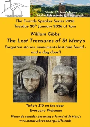 Friends of St Mary's Speakers: William Gibbs - the Lost Treasures of St Mary's Tuesday 20 January 2026 19:00 21:00 Y Gaer Museum & Art Gallery, Brecon (map) Google Calendar ICS William Gibbs will be enlightening listeners about the forgotten stories of St Mary’s Church, Brecon. The talk will cover lost and found monuments and a dog door? Everyone welcome, tickets to be purchased on the door.
